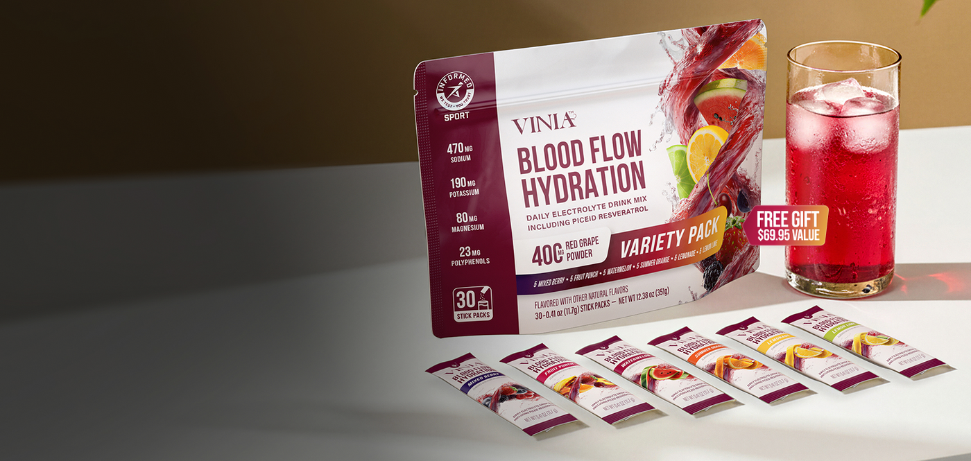 Buy any VINIA® Starter Pack or Bundle (any $99 or more) & Get a FREE VINIA Blood Flow Hydration™ Variety Pack (30 days supply, $69,99 value).
