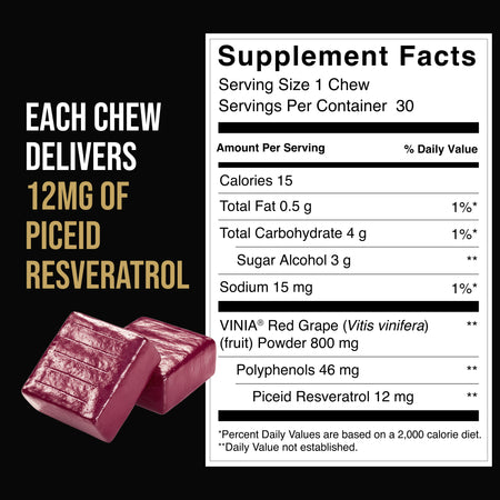 Our red grape cell powder contains polyphenols, beneficial micronutrients that naturally occur in plants. These polyphenols include Resveratrol, Catechins, Quercetins, Anthocyanins, and Tannins. Each Chew of VINIA® Superfood DailyChews 2X contains the same amount of Piceid Resveratrol as 2 bottles of red wine.
