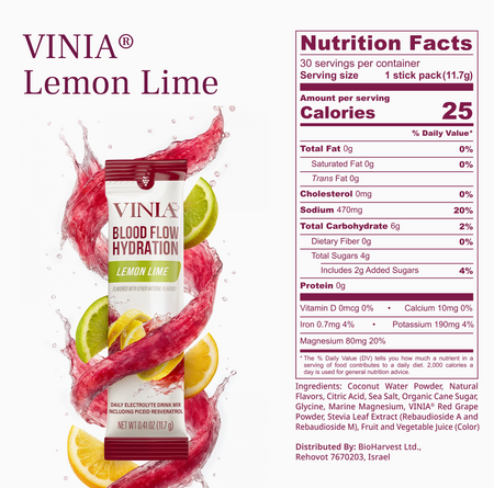 The all-new VINIA Blood Flow Hydration™ is a first-of-its-kind 2-in-1 formula that pairs premium electrolytes with clinically studied red grape polyphenols to do what no ordinary hydration drink can: unlock your body’s own blood flow.
