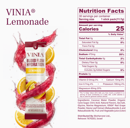 The all-new VINIA Blood Flow Hydration™ is a first-of-its-kind 2-in-1 formula that pairs premium electrolytes with clinically studied red grape polyphenols to do what no ordinary hydration drink can: unlock your body’s own blood flow.