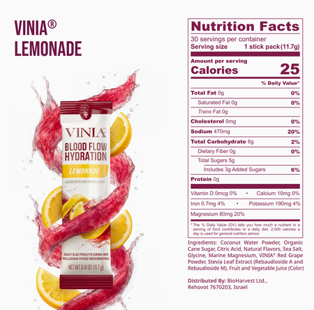 VINIA Blood Flow Hydration:tm: contains 470 mg of sodium per serving, which is approximately 20% of the National Recommended Daily Intake. If you are advised to follow a low-sodium diet or have high blood pressure, we strongly recommend consulting your doctor or healthcare provider before using this product. We always advise speaking with your healthcare professional if you are taking prescription medications or have any underlying health conditions to ensure VINIA Blood Flow Hydration:tm: is appropriate for your individual needs.