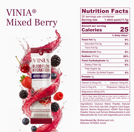 VINIA Blood Flow Hydration:tm: contains 470 mg of sodium per serving, which is approximately 20% of the National Recommended Daily Intake. If you are advised to follow a low-sodium diet or have high blood pressure, we strongly recommend consulting your doctor or healthcare provider before using this product. We always advise speaking with your healthcare professional if you are taking prescription medications or have any underlying health conditions to ensure VINIA Blood Flow Hydration:tm: is appropriate for your individual needs.