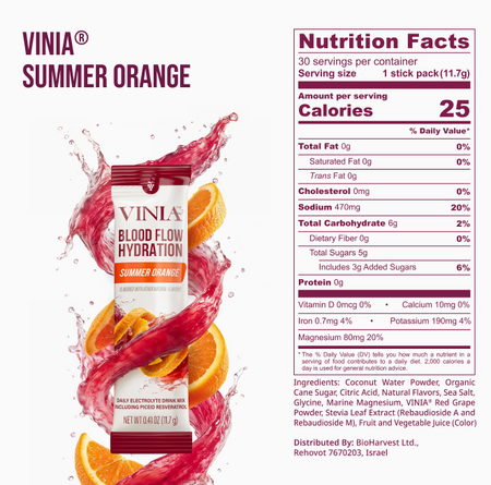 Better hydration starts with better blood flow. Many hydration drinks focus on WHAT goes in. VINIA improves HOW nutrients get delivered. Powered by our red grape polyphenol complex (23mg), including Rapid Absorption Piceid Resveratrol (6mg), VINIA’s Hydration Solution™ boosts Nitric Oxide production, increasing arterial dilation for better blood flow.* Better blood flow means that electrolytes, nutrients, and hydration reach your organs, muscles, and cells — right where they’re needed most.