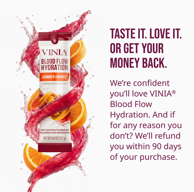 We’re confident you’ll love VINIA® Blood Flow Hydration. And if for any reason you don’t? You get your money back. Simple as that.