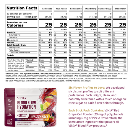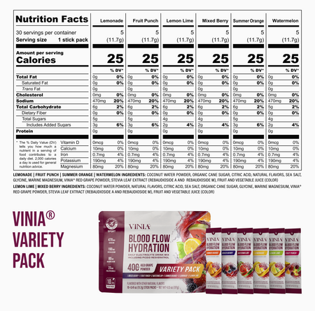 VINIA Blood Flow Hydration:tm: contains 470 mg of sodium per serving, which is approximately 20% of the National Recommended Daily Intake. If you are advised to follow a low-sodium diet or have high blood pressure, we strongly recommend consulting your doctor or healthcare provider before using this product. We always advise speaking with your healthcare professional if you are taking prescription medications or have any underlying health conditions to ensure VINIA Blood Flow Hydration:tm: is appropriate for your individual needs.