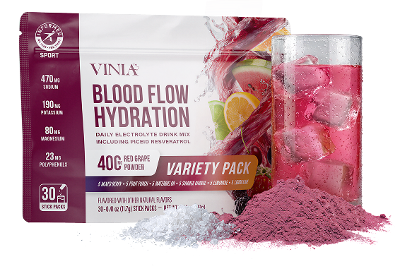The all-new VINIA Blood Flow Hydration™ is a first-of-its-kind 2-in-1 formula that pairs premium electrolytes with clinically studied red grape polyphenols to do what no ordinary hydration drink can: unlock your body’s own blood flow.