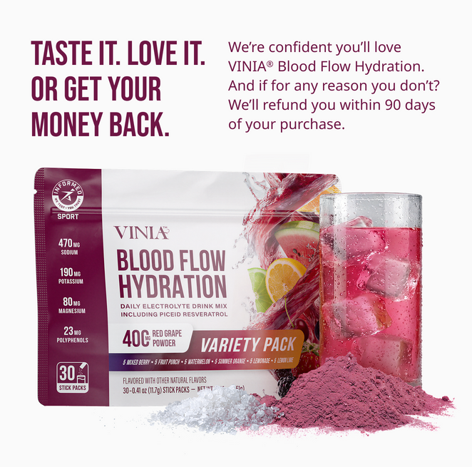 We’re confident you’ll love VINIA® Blood Flow Hydration. And if for any reason you don’t? You get your money back. Simple as that.