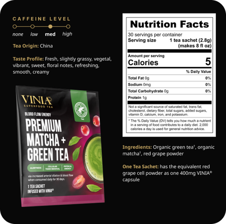 The primary ingredients in VINIA® Premium Matcha + Green Tea are organic Chinese matcha, organic Chinese green tea, and red grape cell powder. Our red grape cell powder contains polyphenols, beneficial micronutrients that naturally occur in plants. These polyphenols include Resveratrol, Catechins, Quercetins, Anthocyanins, and Tannins. One sachet of VINIA® Superfood Tea contains the same amount of Piceid Resveratrol as a bottle of red wine.