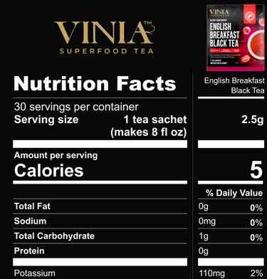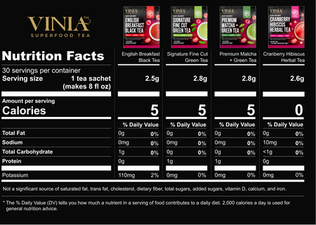 Today, we offer VINIA™ Superfood Tea in 4 delicious flavors: English Breakfast Black Tea, Signature Fine Cut Green Tea, Cranberry Hibiscus Herbal Tea (With Natural Cranberry Flavor) — CAFFEEINE FREE, and Premium Matcha + Green Tea.