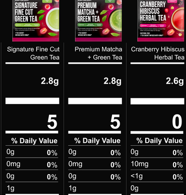 English Breakfast Black Tea: Organic black tea†, red grape powder; Signature Fine Cut Green Tea: Organic green tea†, red grape powder; Premium Matcha + Green Tea: Organic green tea†, red grape powder, organic matcha†; Cranberry Hibiscus Herbal Tea: Organic hibiscus†, organic rosehips, red grape powder, natural cranberry flavor, organic chamomile†