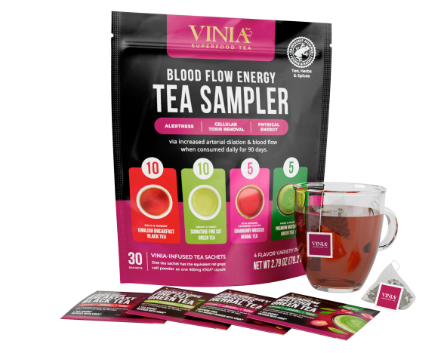 Packed with flavor, our Superfood Tea (available in 4 unique and delicious flavors) is infused with VINIA, a breakthrough red grape cell powder for improved cellular toxin removal, alertness and physical energy via increased dilation of arteries and blood flow.*